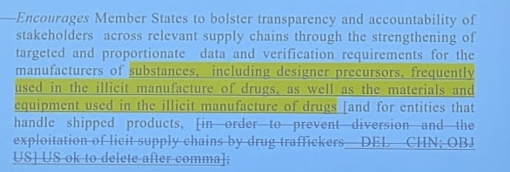China: Misunderstanding between sponsors and us. We just wanted to delete the first part of the paragraph. We suggest: ‘Encourage member states to cooperate with stakeholders across…’. We also suggest keeping ‘in order to prevent diversion and the exploitation of licit supply chains by drug traffickers’. WE suggest deleting ‘including designer precursors’. And say ‘substances frequently used in the illicit manufacture of drugs, as well as related materials and equipment….’.