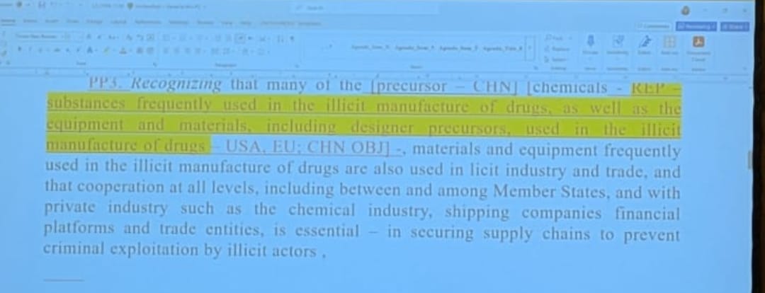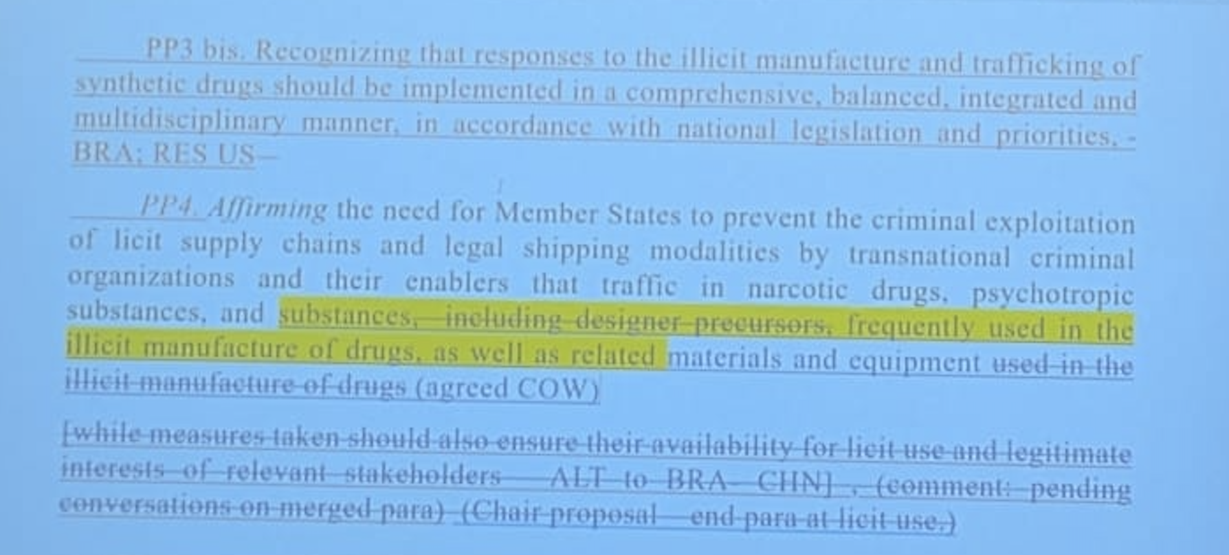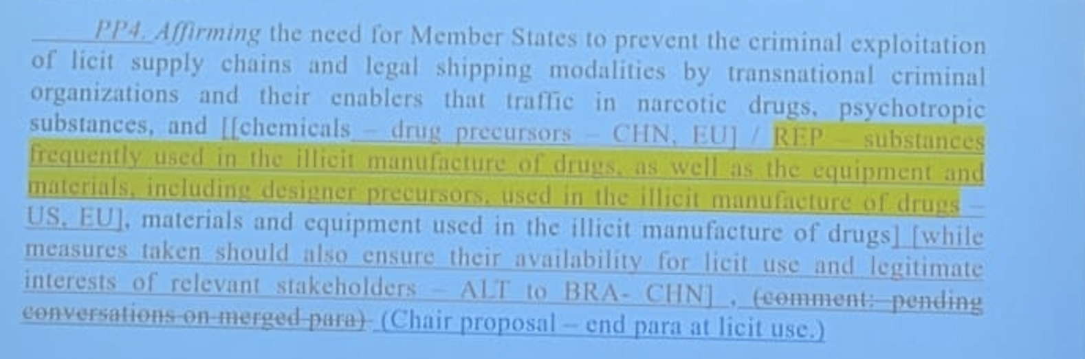 Chair: “Recognising that many of the substances including designer precursors frequently used in the illicit manufacture of drugs as well as the materials and equipment used in the illicit manufacture of drugs…”