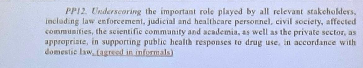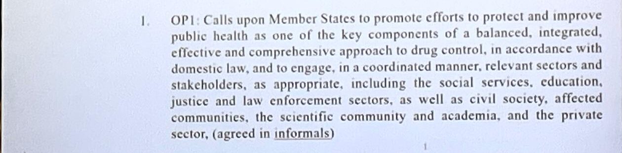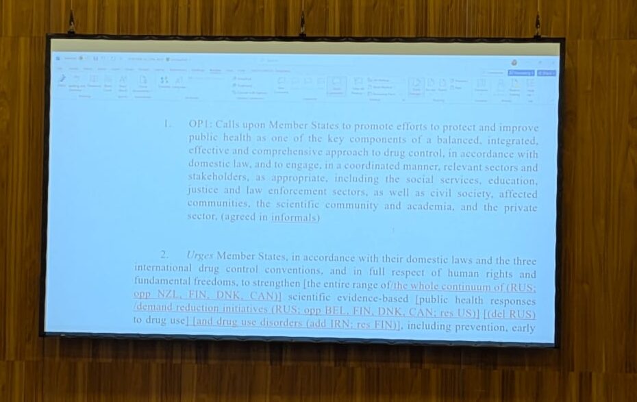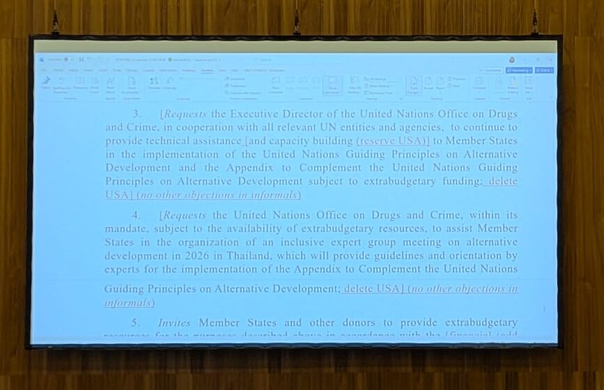Peru: Of course, my delegation would like to retain this paragraph. The issue of technical assistance and capacity building is of utmost importance for the sponsors and countries who benefit from alternative development efforts. To give a tangible example of its importance: tomorrow, we will have, the delegation of Peru, the launch of an alternative development coffee that results from the technical assistance and capacity building provided by states who worked with us. This is in the rotunda. It demonstrates the importance beyond policy discussion. You will hear from the ambassador of a women cooperative who has benefited from these programmes. It’s not the words of the delegates but of beneficiaries.