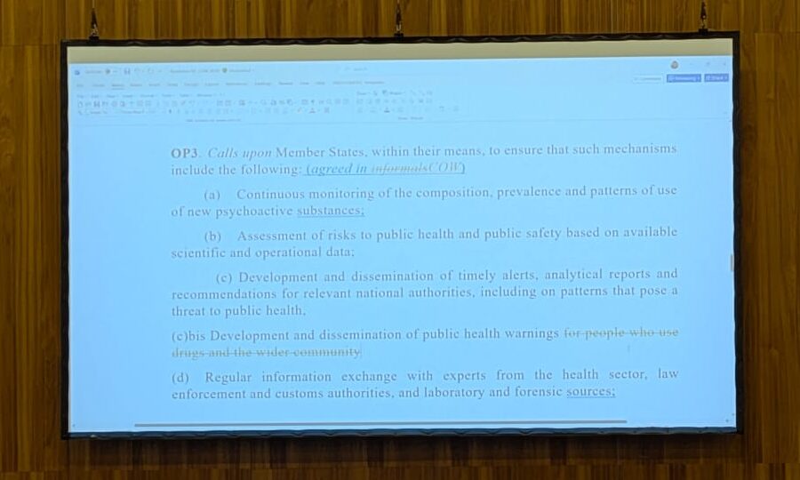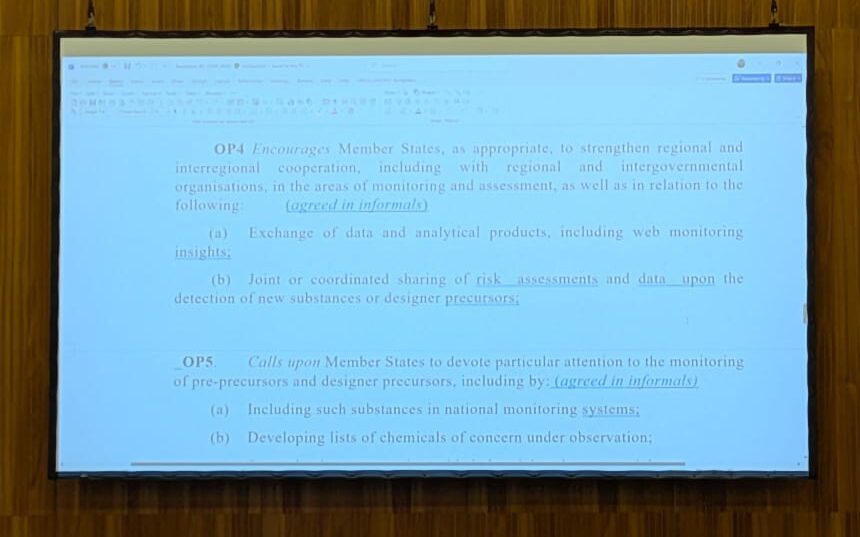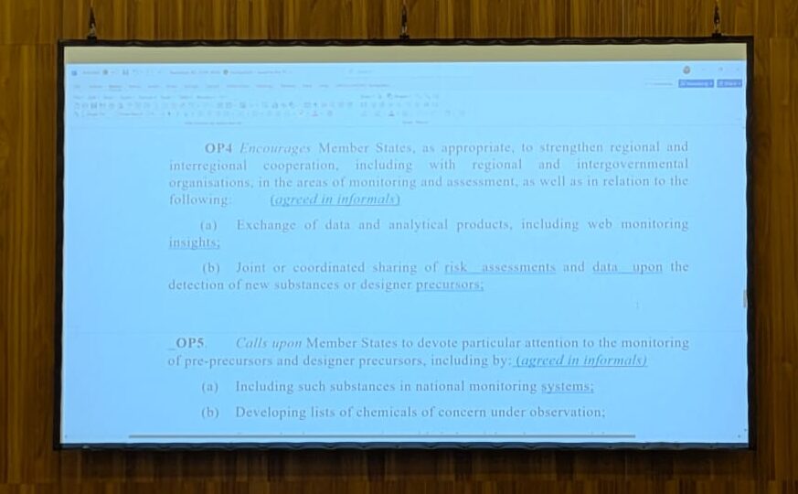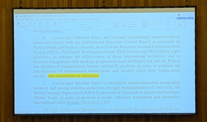 United States: This formulation we’re having difficulty with during informals. We want to continue consulting. Drug precursors is too narrow a term here because it does not capture all chemicals in the illicit manufacture of drugs. There are different definitions domestically on what ‘drug precursors’ are. So we will bring back a proposal after consultations.