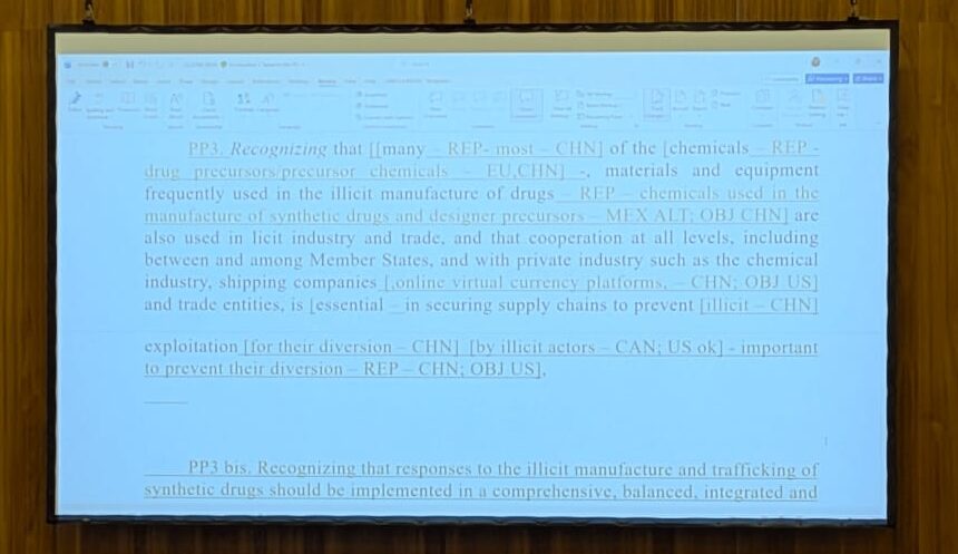 Mexico: Our approach with all delegations is to be technically accurate. In this case, because we are focused on article 13, without qualifiers. This is for illicit production and manufacturer — there’s no qualifier. This proposal diverts from the wording of the conventions. We ask for China to be flexible on this. We include qualifiers in the body of the text where needed but not on this issue.